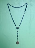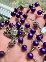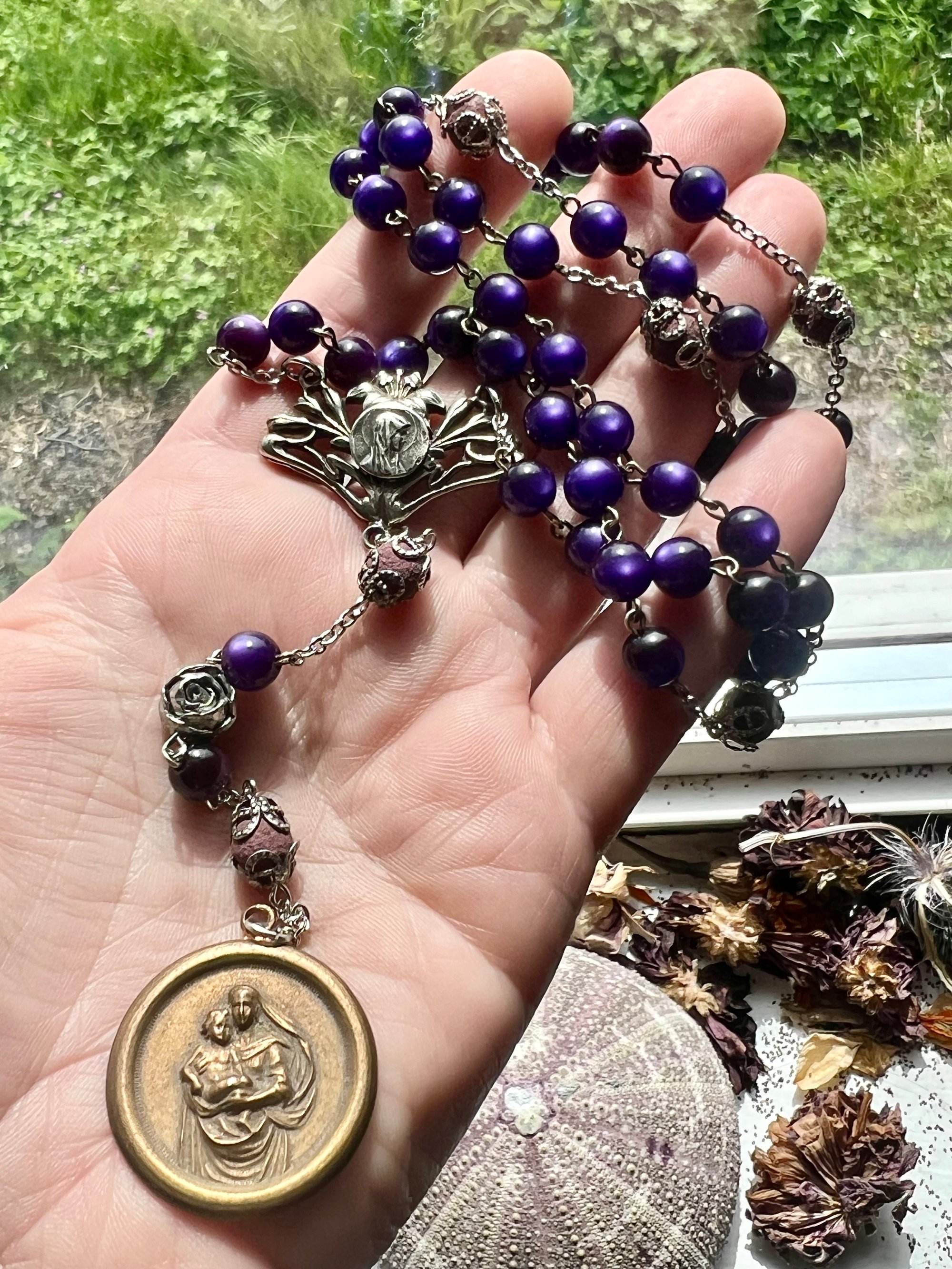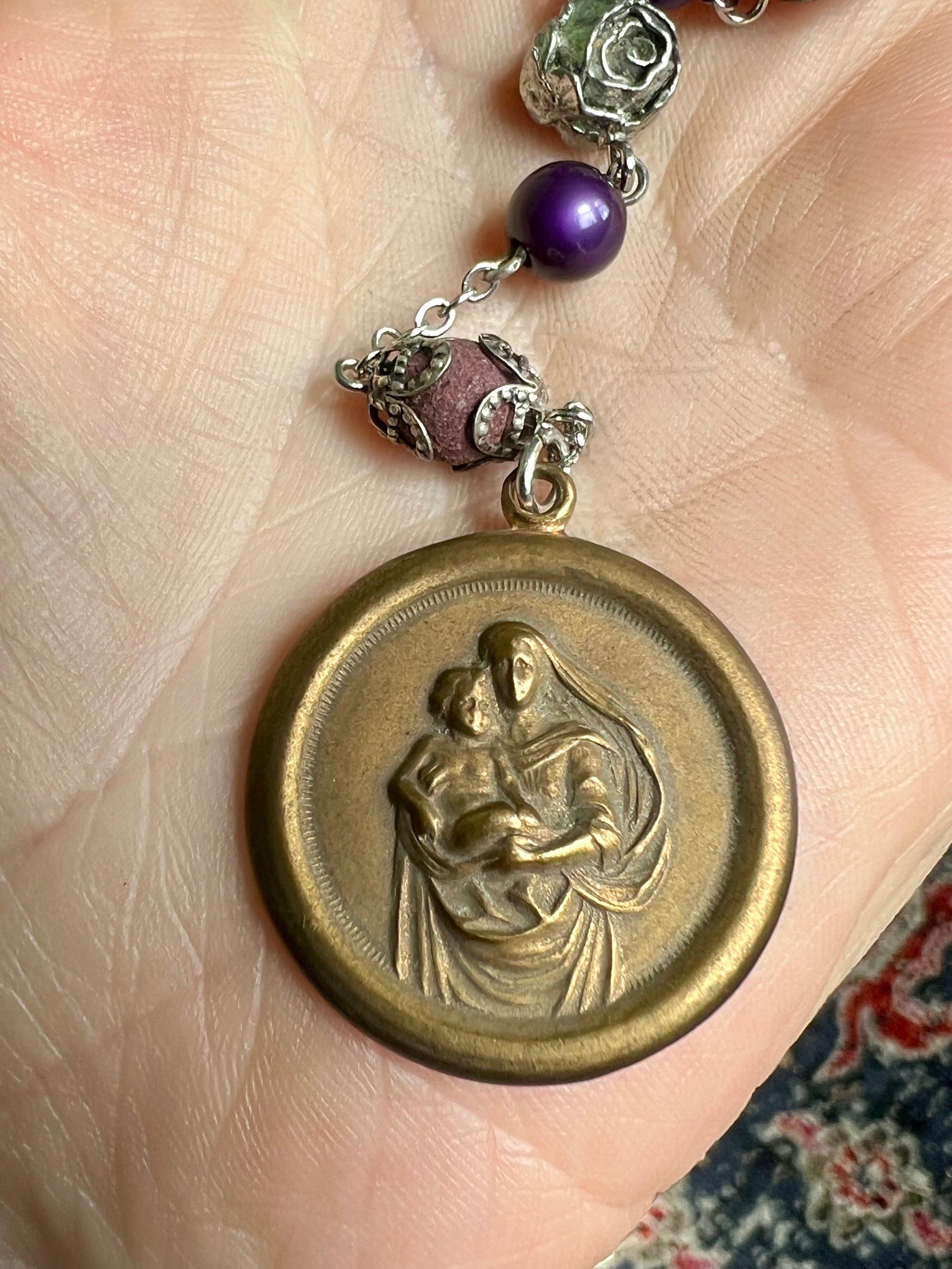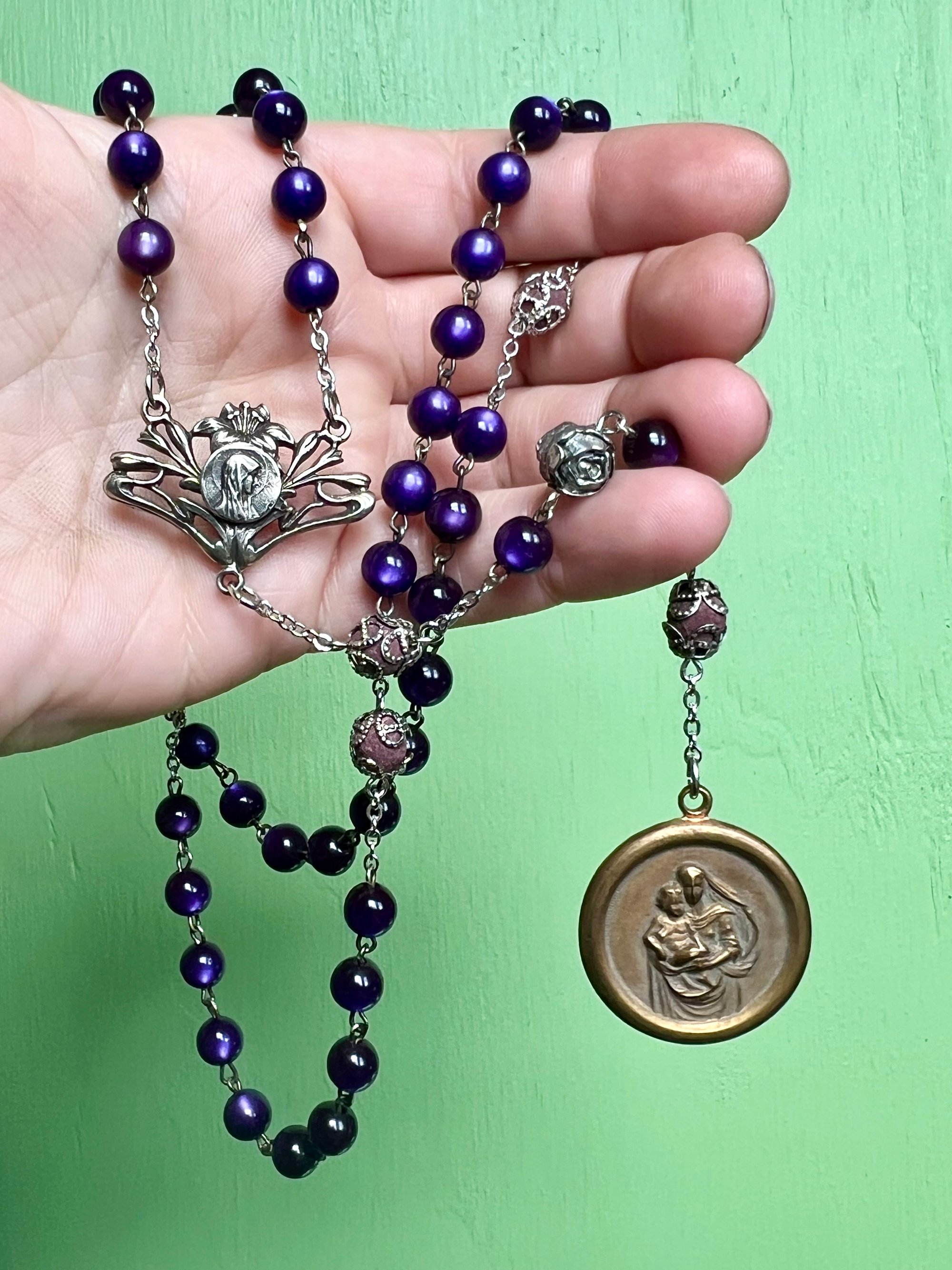 This is an antique royal purple bead rosary with beautiful wear and patina. It includes an art nouveau Mary connector, an antique Mary medal from the 1920s (dipped in water from Lourdes), a silver carved rose bead and 6 traditional style rosary beads made with real rose petals.
