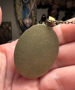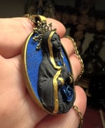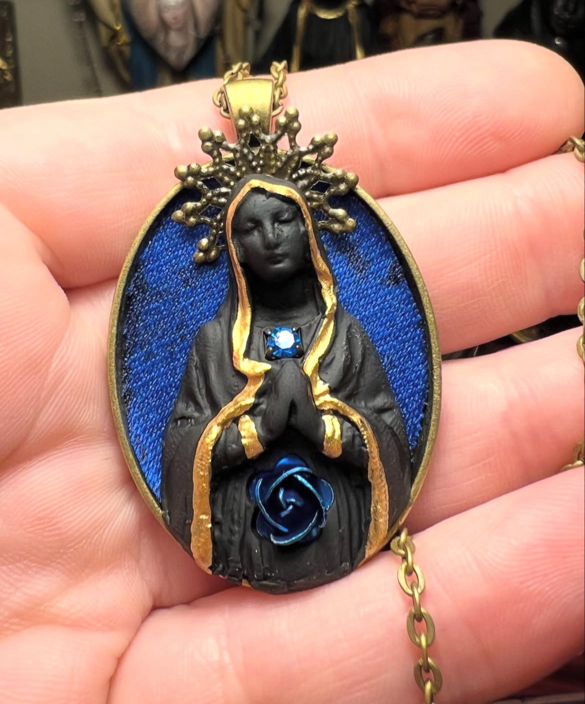 Blue Rose Magdalene Pendant necklace, made with black clay and handpainted. Metal blue Rose, blue rhinestone, brass halo and mounted on a piece of saree fabric brought back from my travels in India and blessed with waters of Maa Ganga and Lourdes