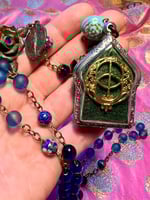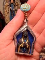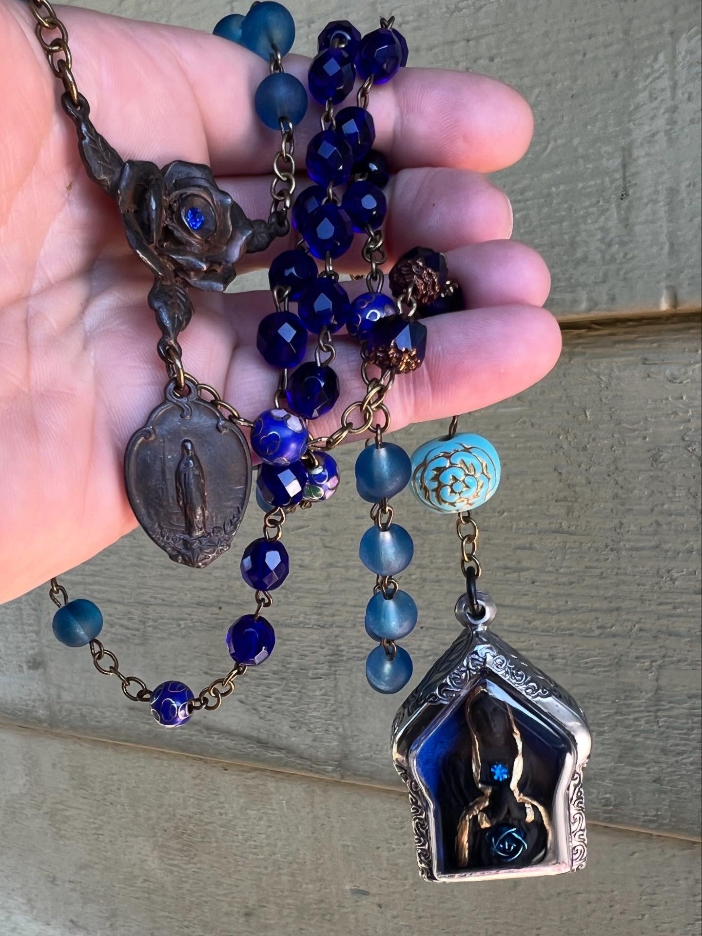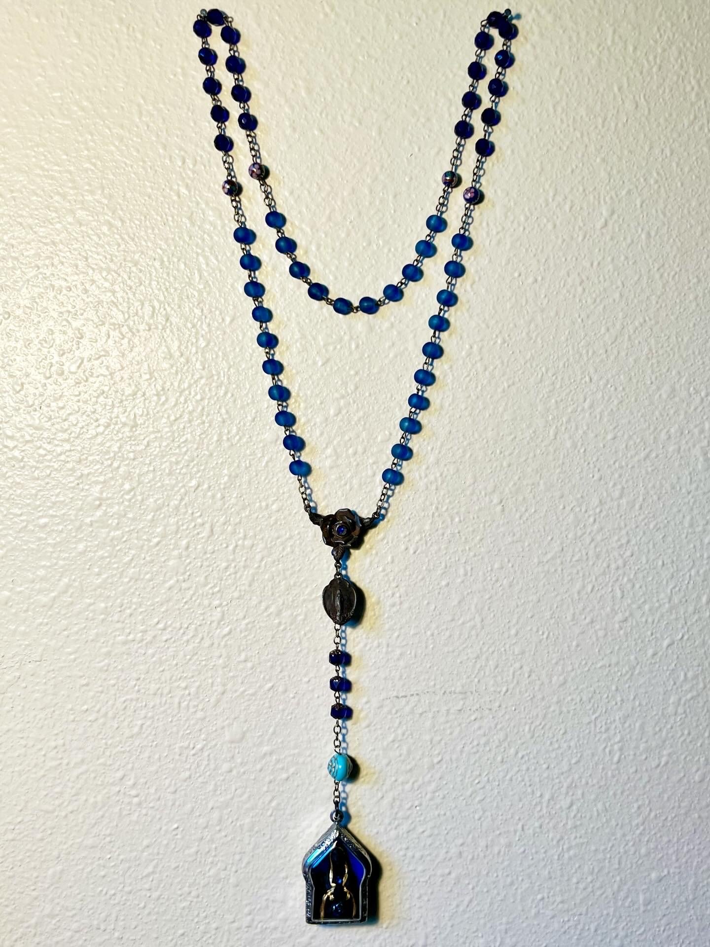 A handmade rosary with blue sea glass beads, faceted sapphire blue glass beads, blue cloisonné beads, a blue rose, rusty rose connector, rusty dark mother pendant, and a handmade shrine box with a Black Madonna made in clay and painted, with metal blue rose and blue rhinestone. Two pieces of sarees from my pilgrimage to India and blessed with the waters of Maa Ganges and Lourdes, and a pendant of the Chalice well made by artist Lilavati Rose in Glastonbury