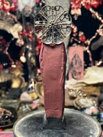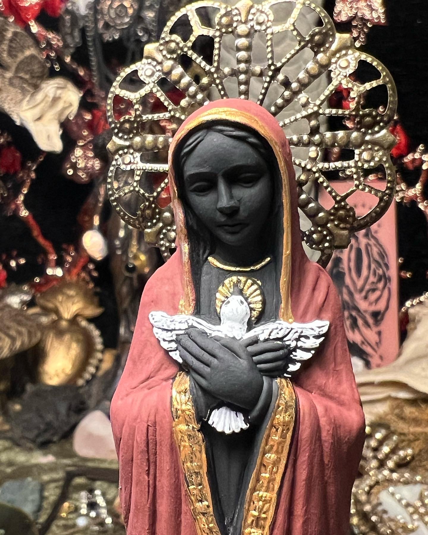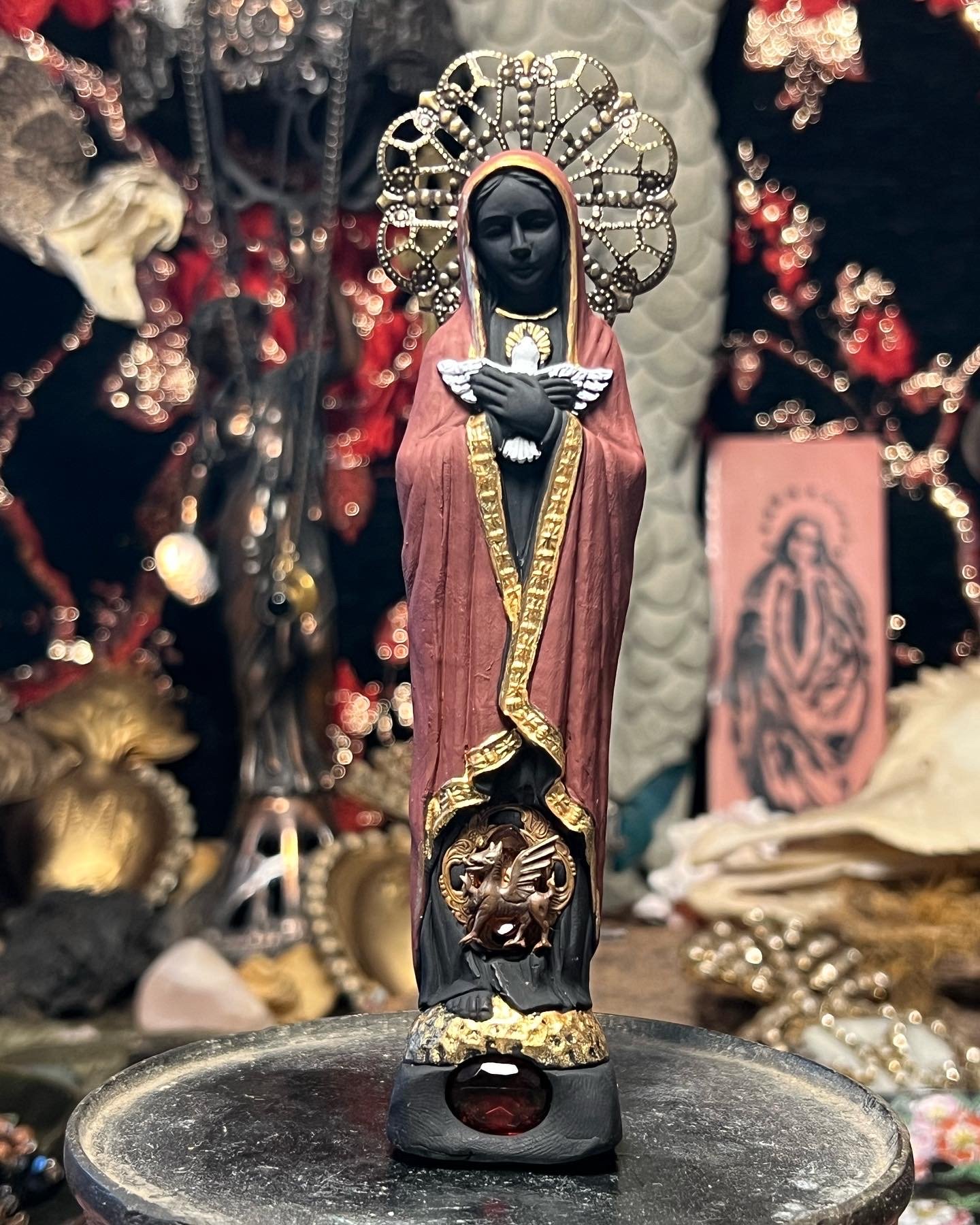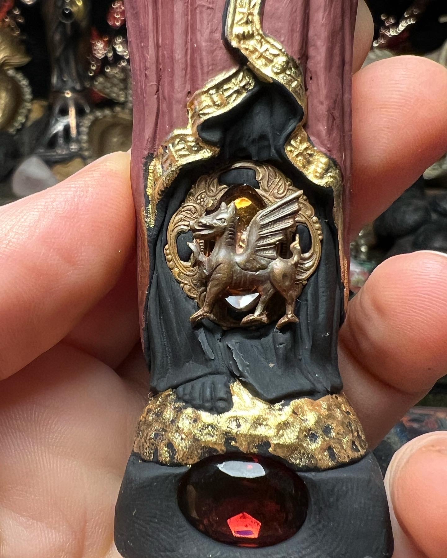 Sophia figure Made with black clay, hand painted with vintage dragon and glass pendant, red faceted glass stone and brass halo.