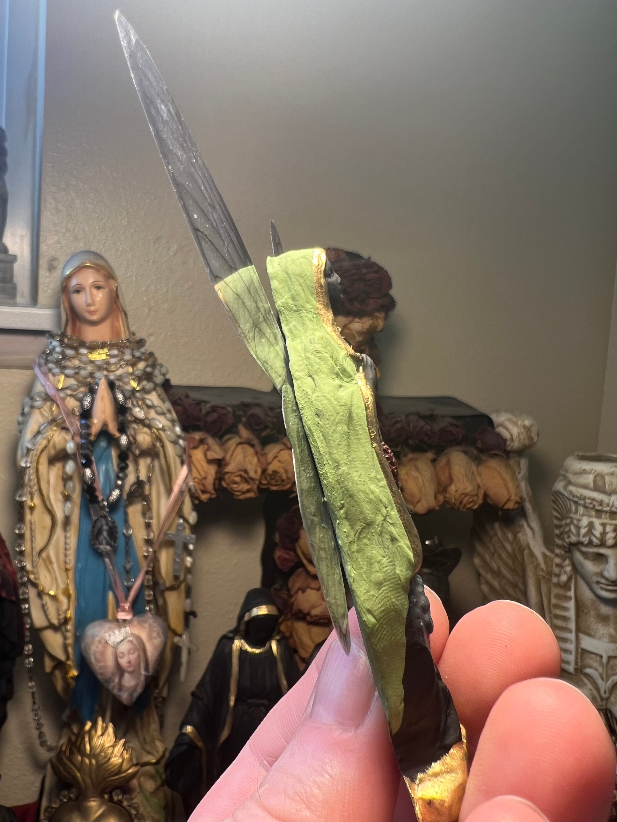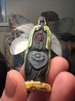 Hawthorn Fairy figure Made with black clay, hand painted with a dried Hawthorn berry from a sacred tree at the Black Magdalene home, a glass heart, black rhinestone and wings made of thin transparency paper and glued on back with brass peacock charm. In Celtic mythology, the Hawthorn Tree was considered sacred and often associated with the fae realm (fairies). Celts believed it served as a gateway between the physical and spiritual worlds. Hawthorn berries are also know to balance your heart chakra, help with grief and protect you from negative energies