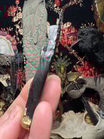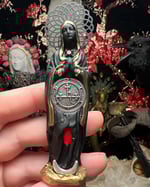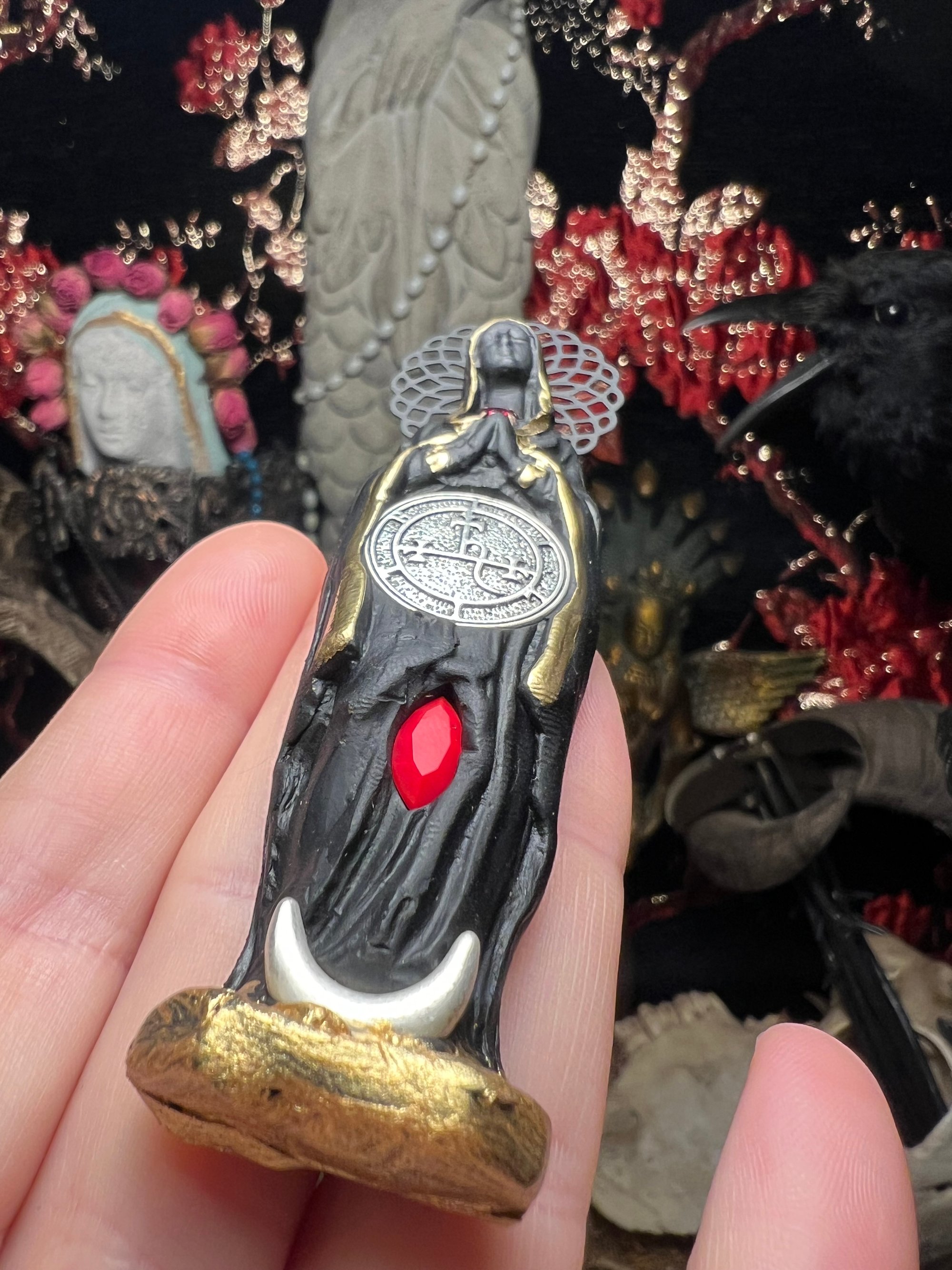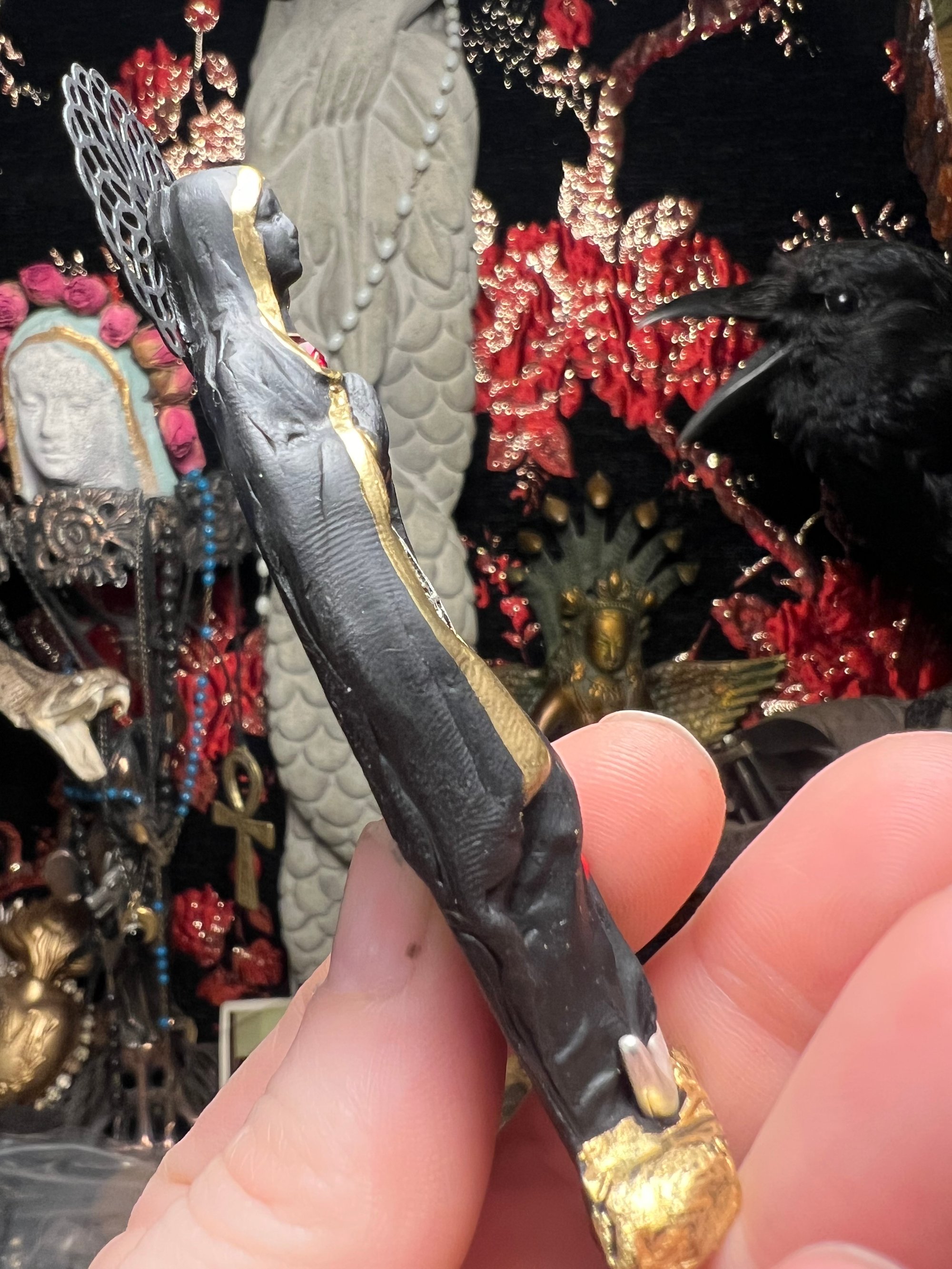 Lilith figure made with clay, paint, a silver sigil charm, a red glass navette, a red rhinestone, silver moon and black halo