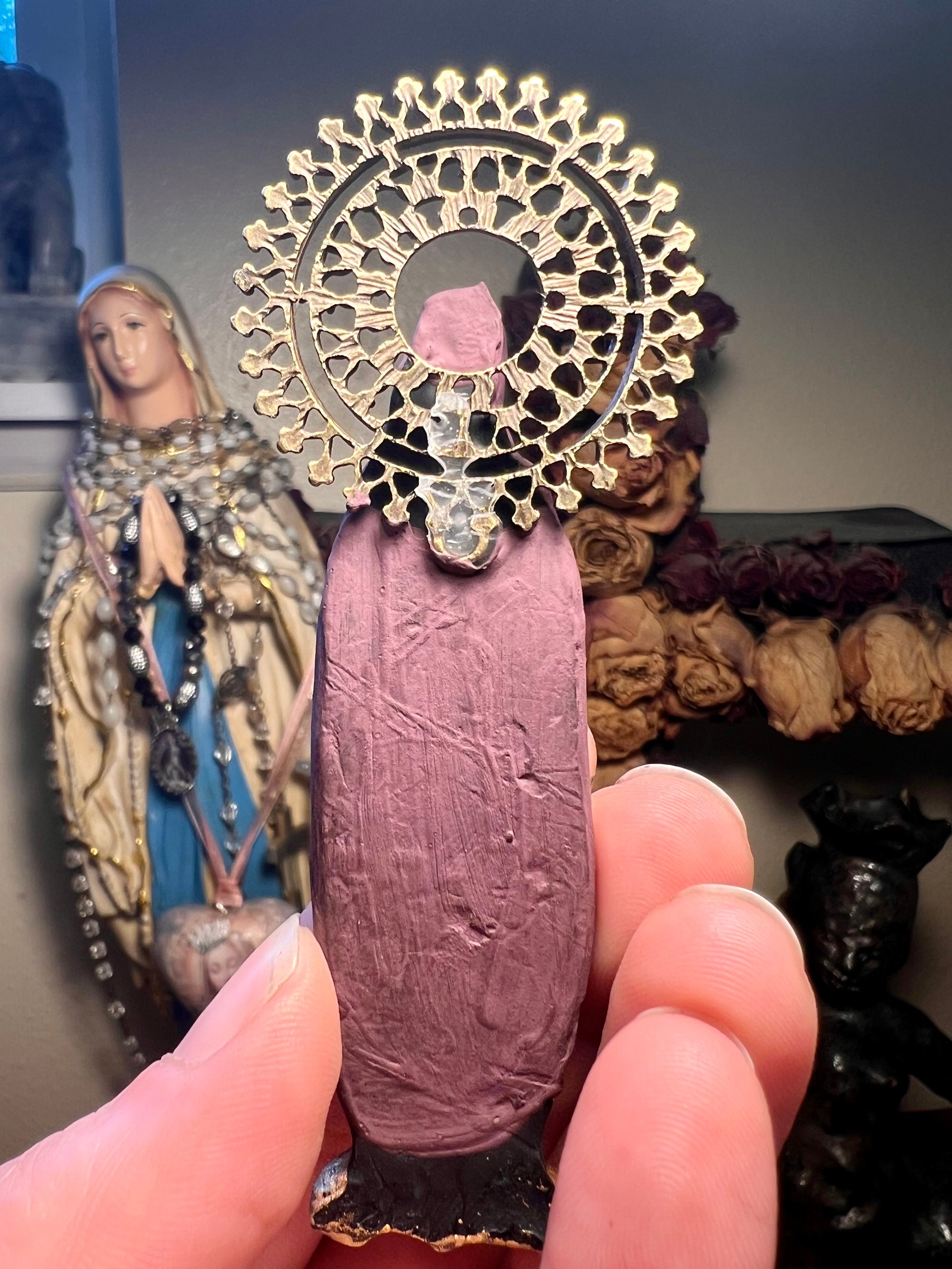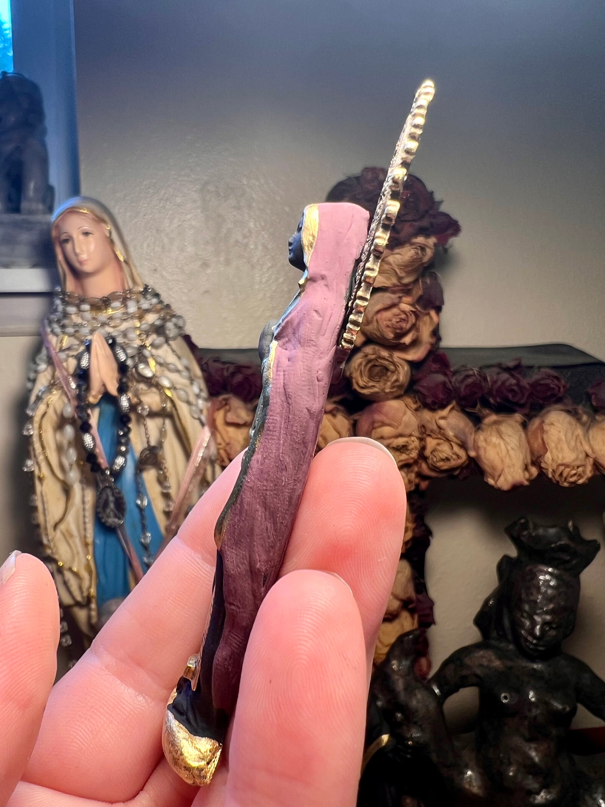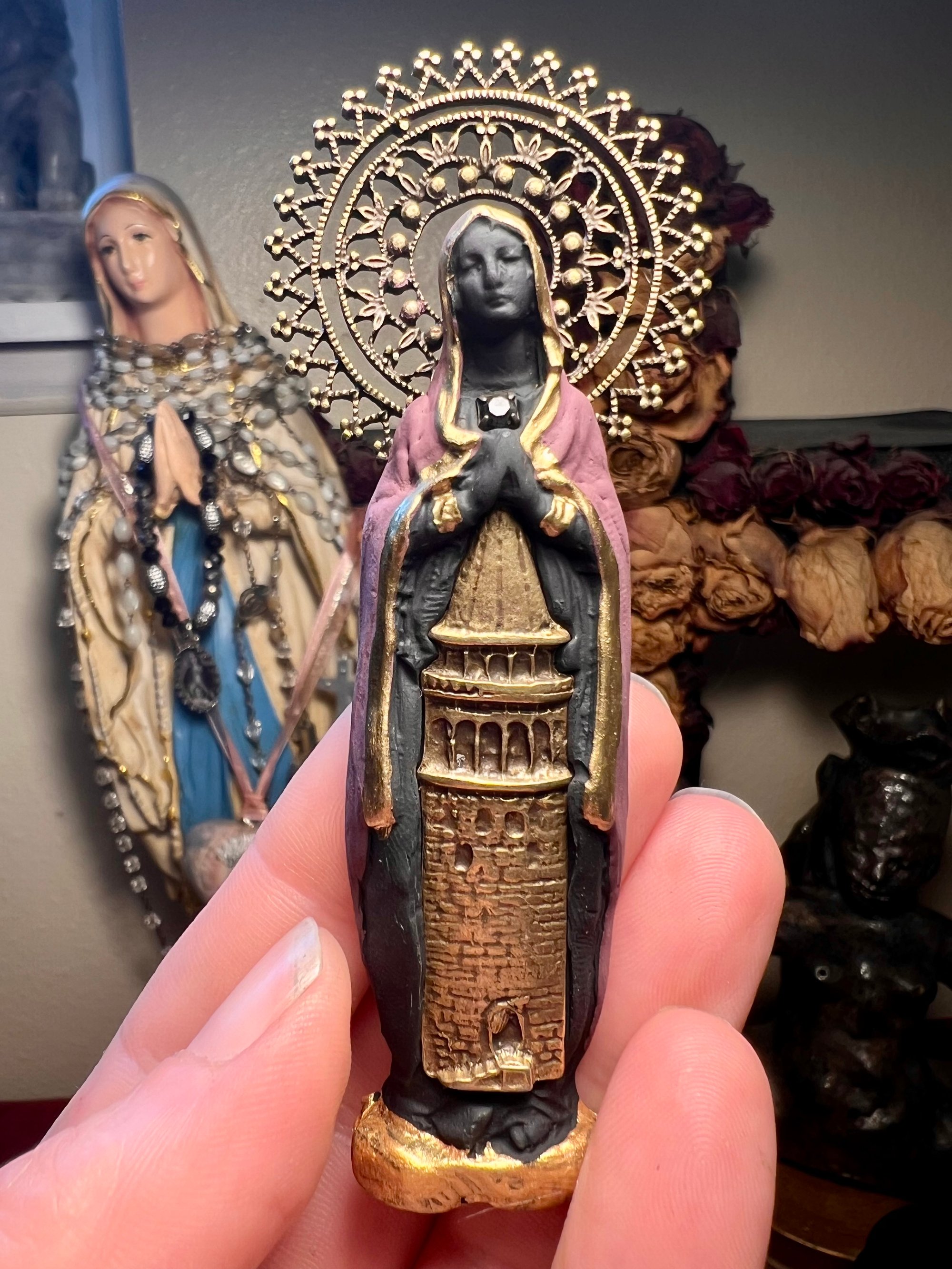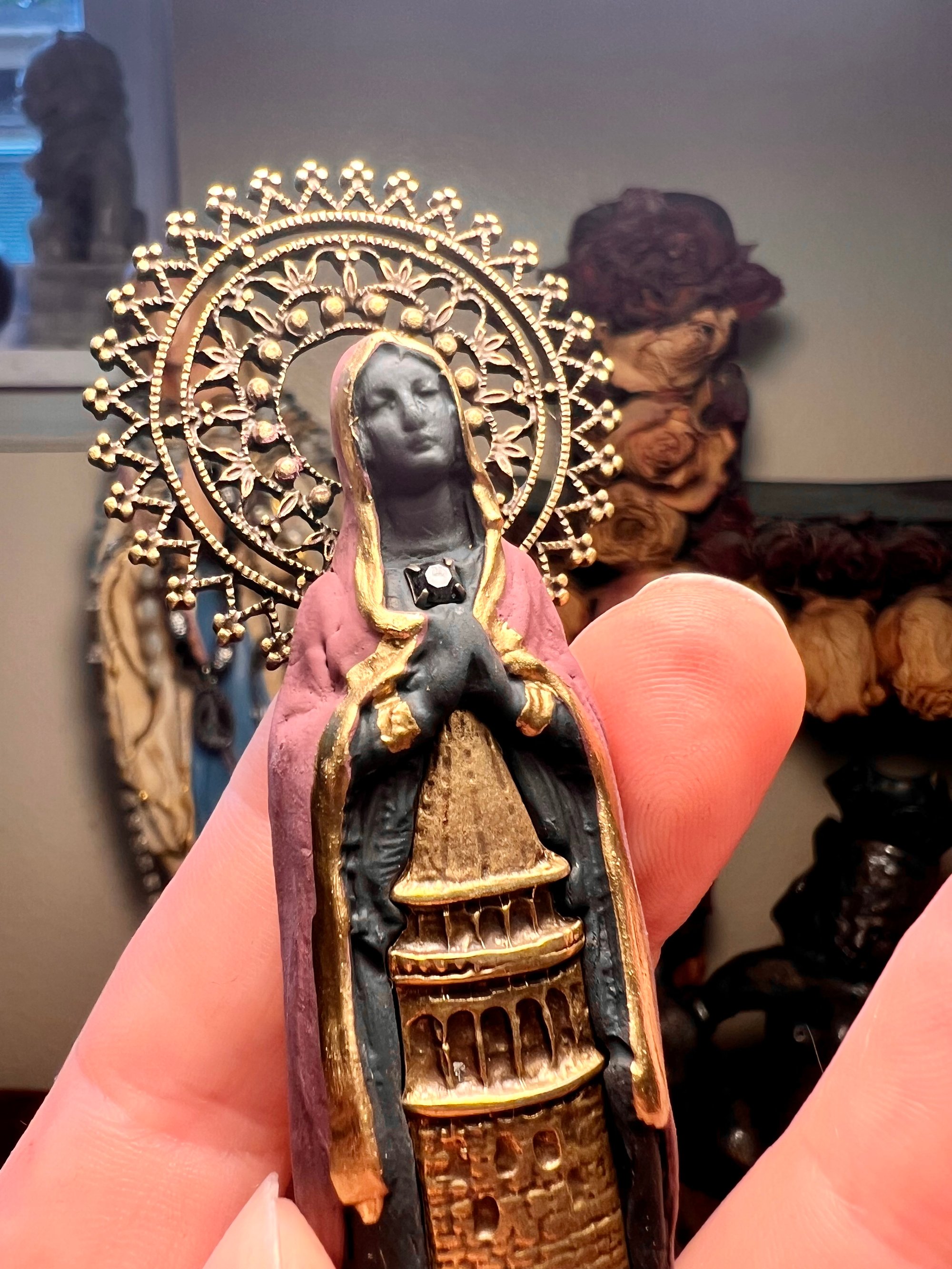 Mary Magdalene figure Made with clay, hand painted with brass tower pendant, black rhinestone, and brass halo.