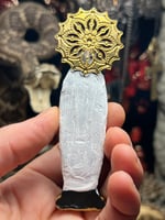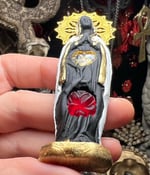 Mary and the Unicorn figure. Made with clay, hand painted with vintage glass unicorn heart bead, glass red frosted rose, white rhinestone and gold halo