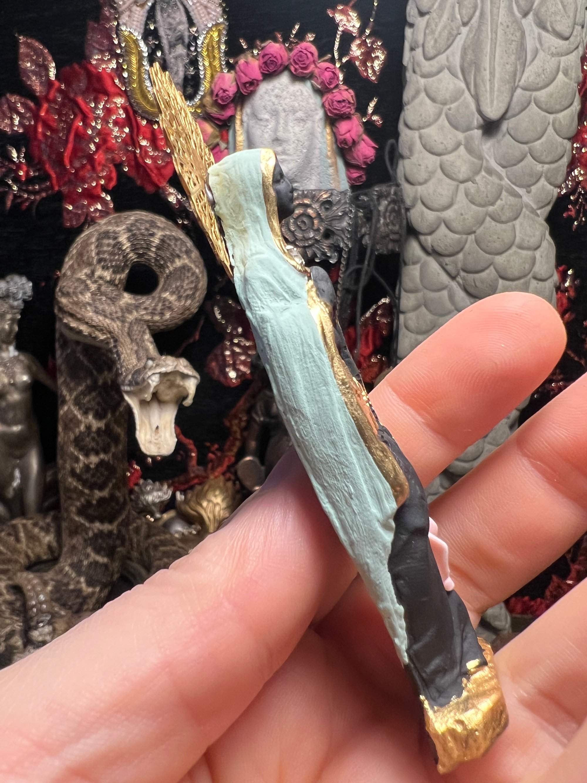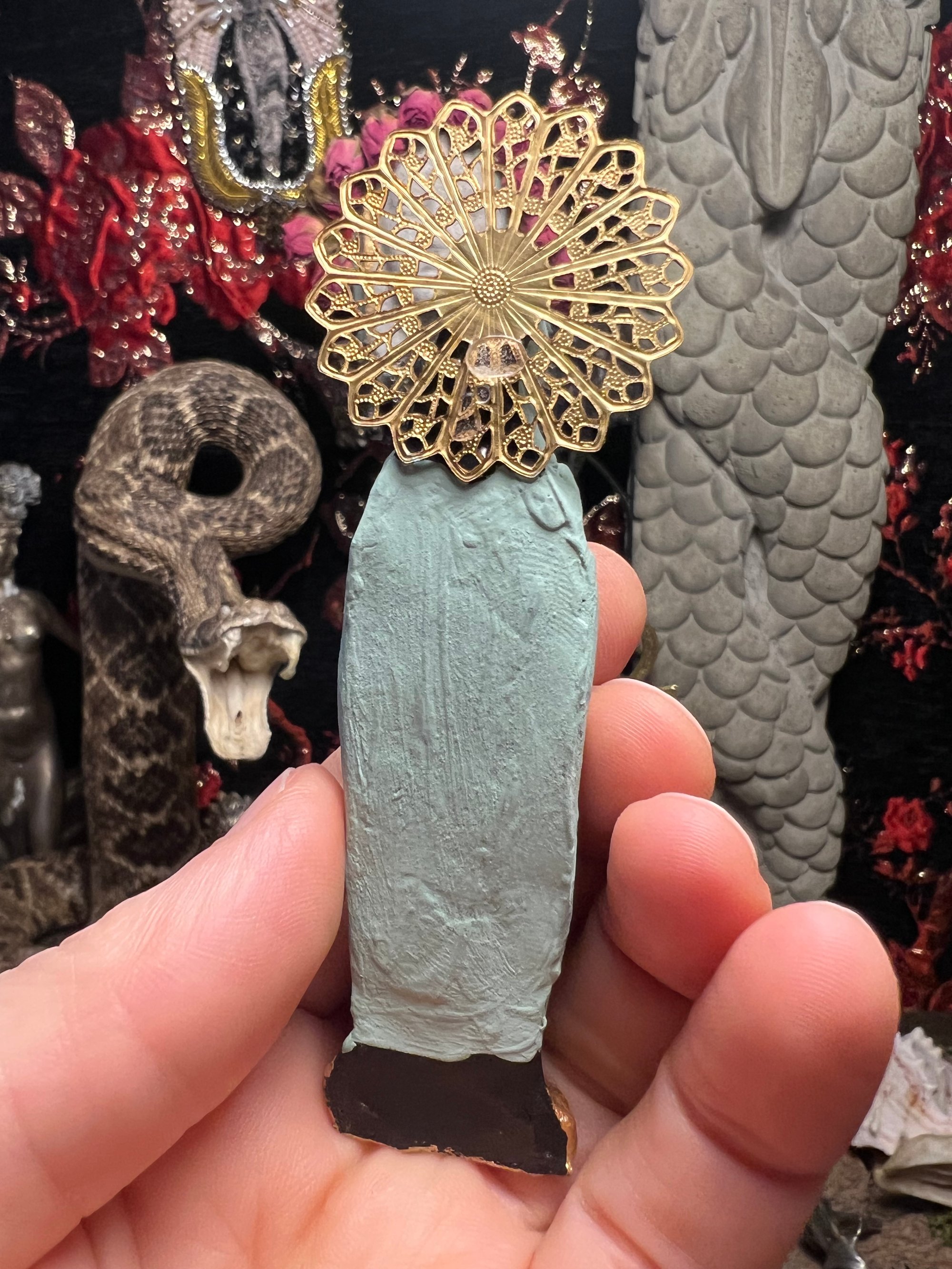 Melissae bee priestess figure. Made with clay, hand painted with vintage beehive stamping, porcelain pink rose, vintage rhinestone and gold halo