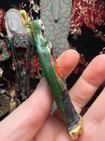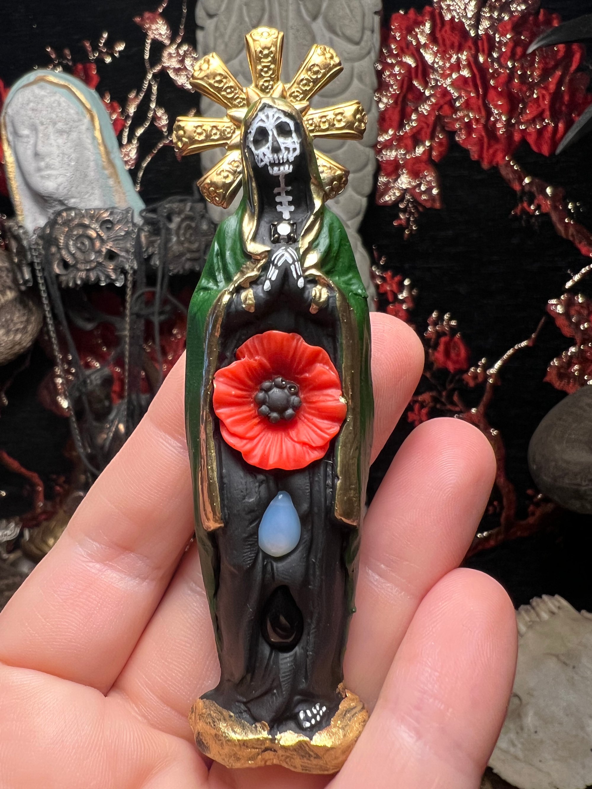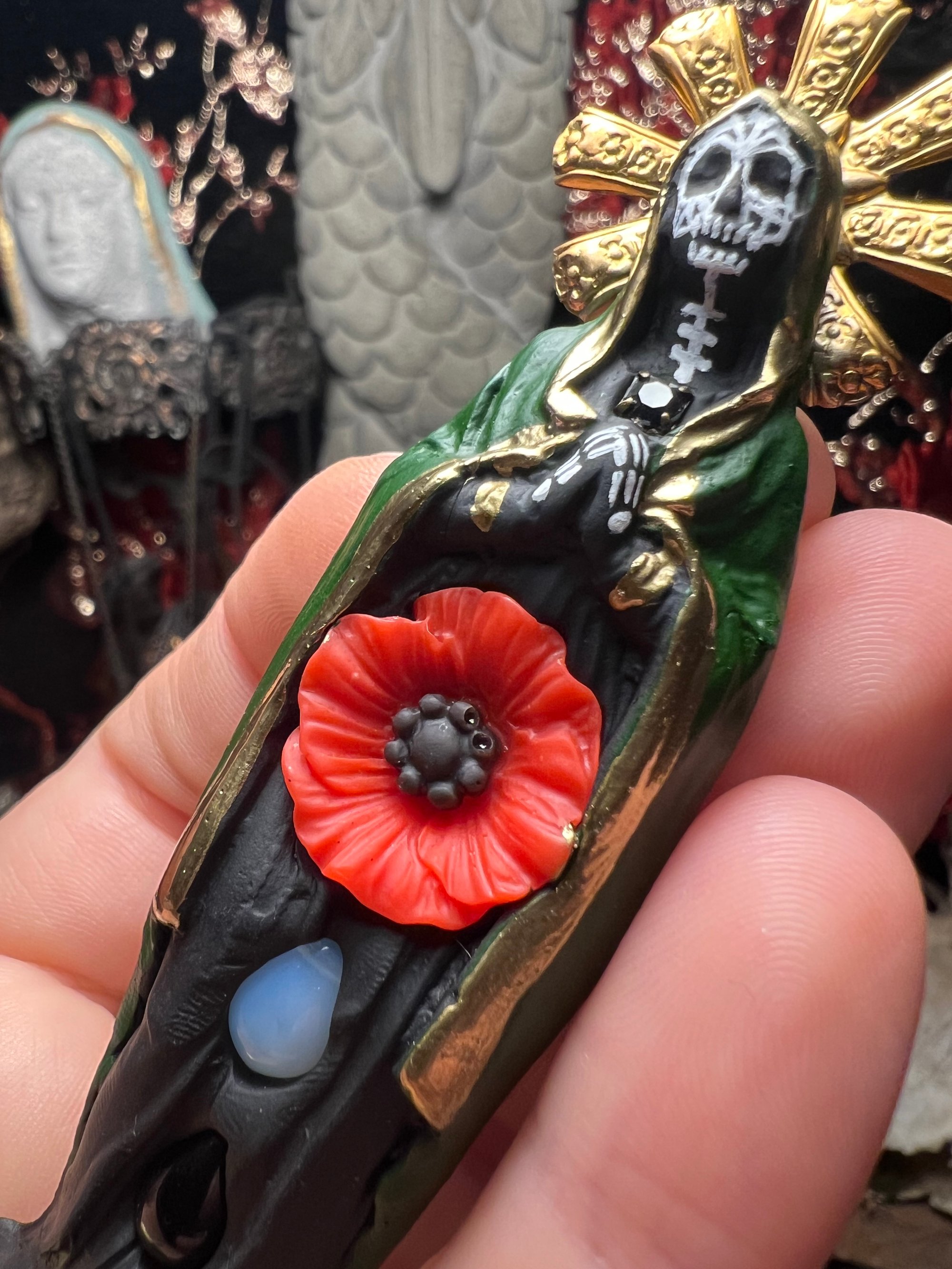 Poppy Santa Muerte figure Made with clay, hand painted with poppy flower cabachon, white glass droplet stone, black glass droplet stone, black rhinestone and brass halo.