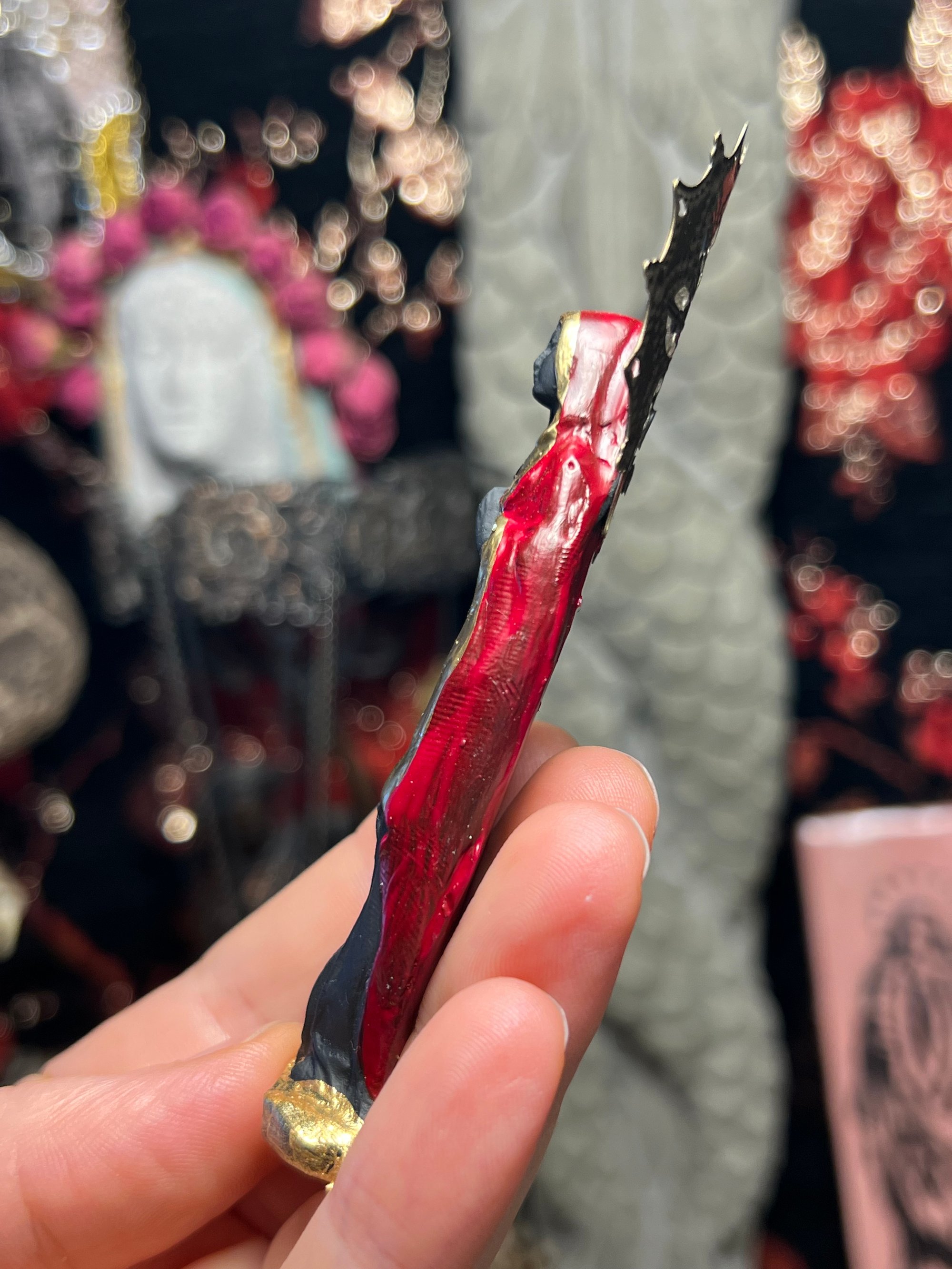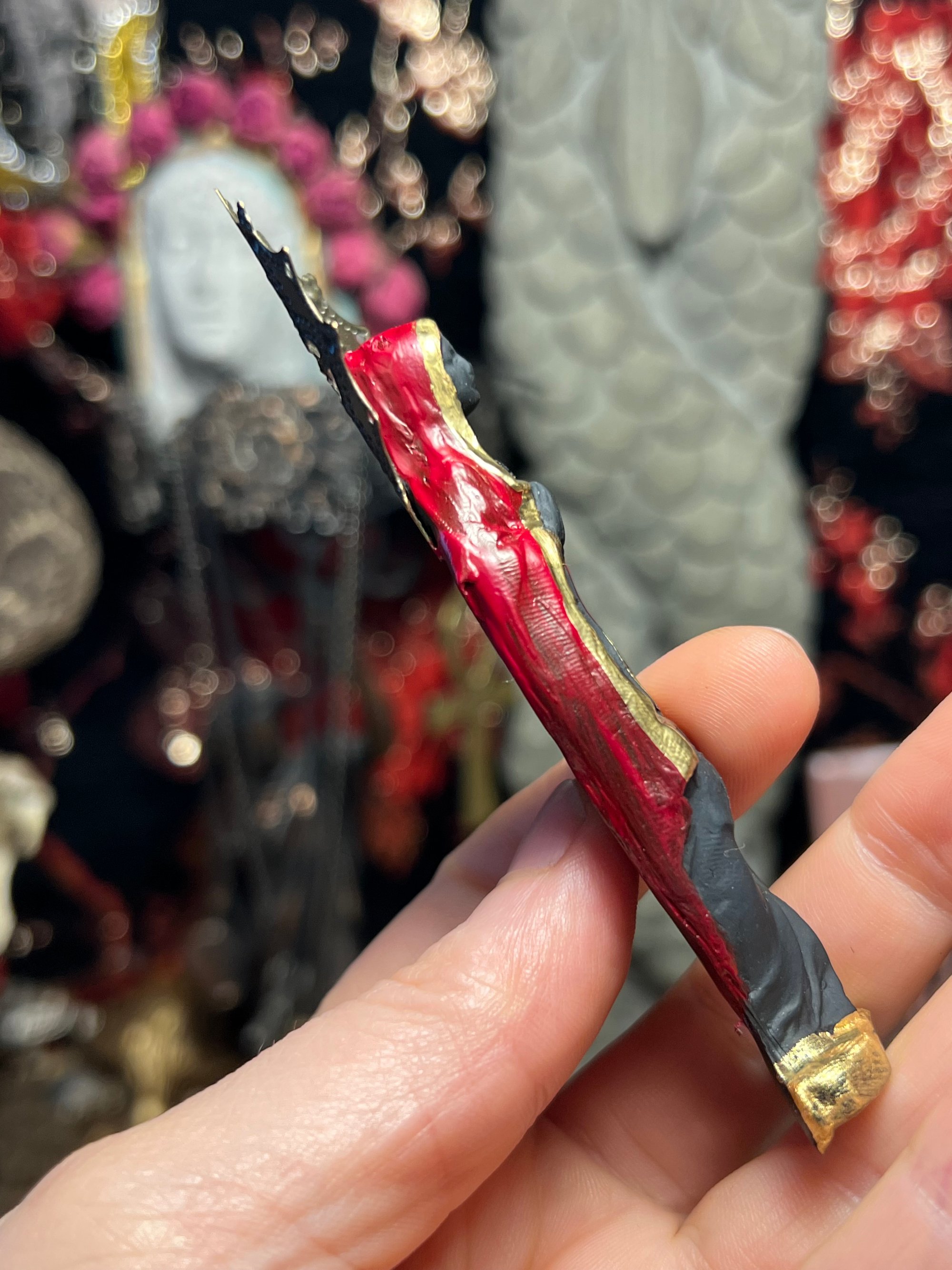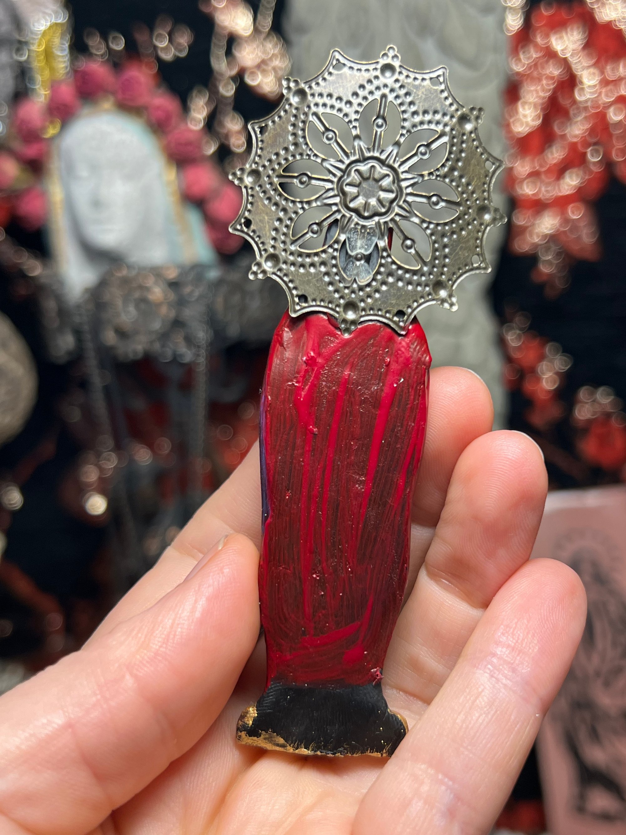 Figure made with clay, paint, brass stampings, black rhinestone and brass halo