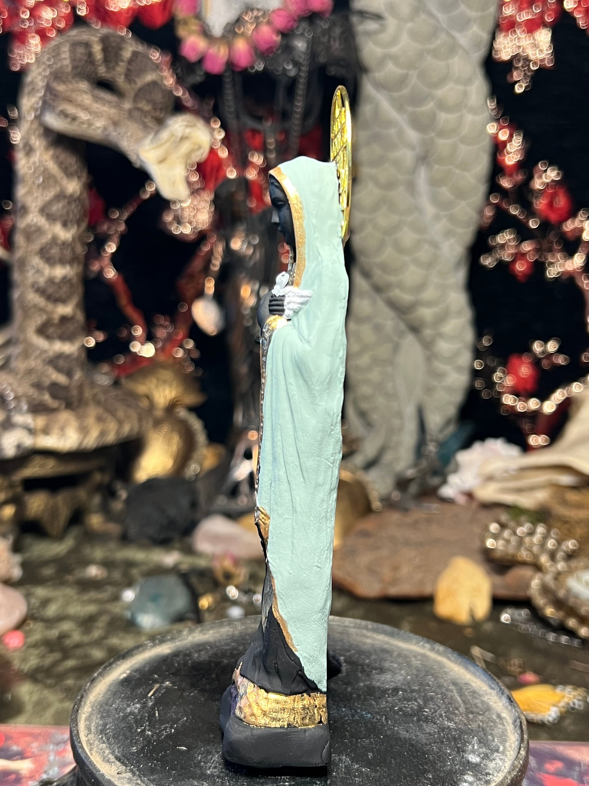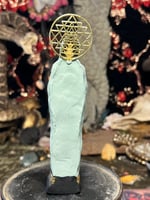 Sophia figure Made with black clay, hand painted with ceramic flower of life bead, amethyst stone and gold Sri Yantra halo.