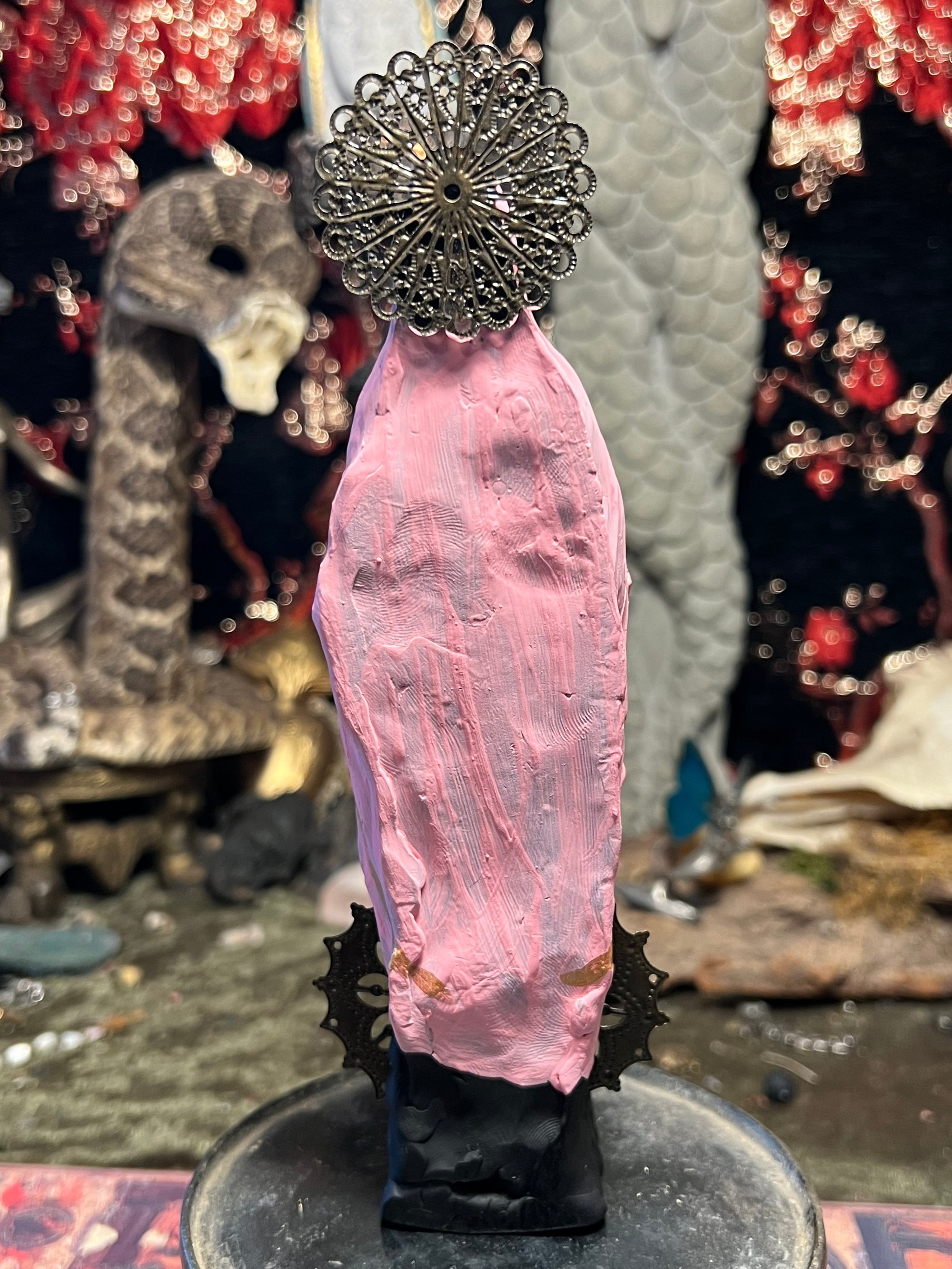 This is a handmade and hand painted black clay statue of Santa Muerte with a pink and gold robe. Stands 7.8 inches tall and 1.5 inch wide by 1.5 inch deep. Had pewter sacred heart pendant, black rhinestones, brass halo and brass components. Comes with a hand painted miniature skeleton cat. This will be custom made when ordered, please allow 2 weeks for completion before shipping.