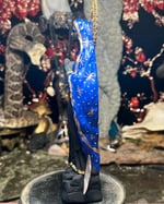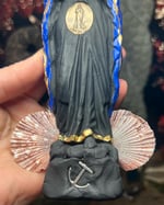 Standing Stella Maris Black Madonna statue, handmade to order with solid black clay, and hand painted cobalt blue cape with gold stars and details. Includes glass sapphire Star cabachon, a brass Stella Maris rosary medal, a silver anchor, two real shells, and a brass halo. Statue measures 7.5” tall (19 cm) by 2” wide by 1.5” deep