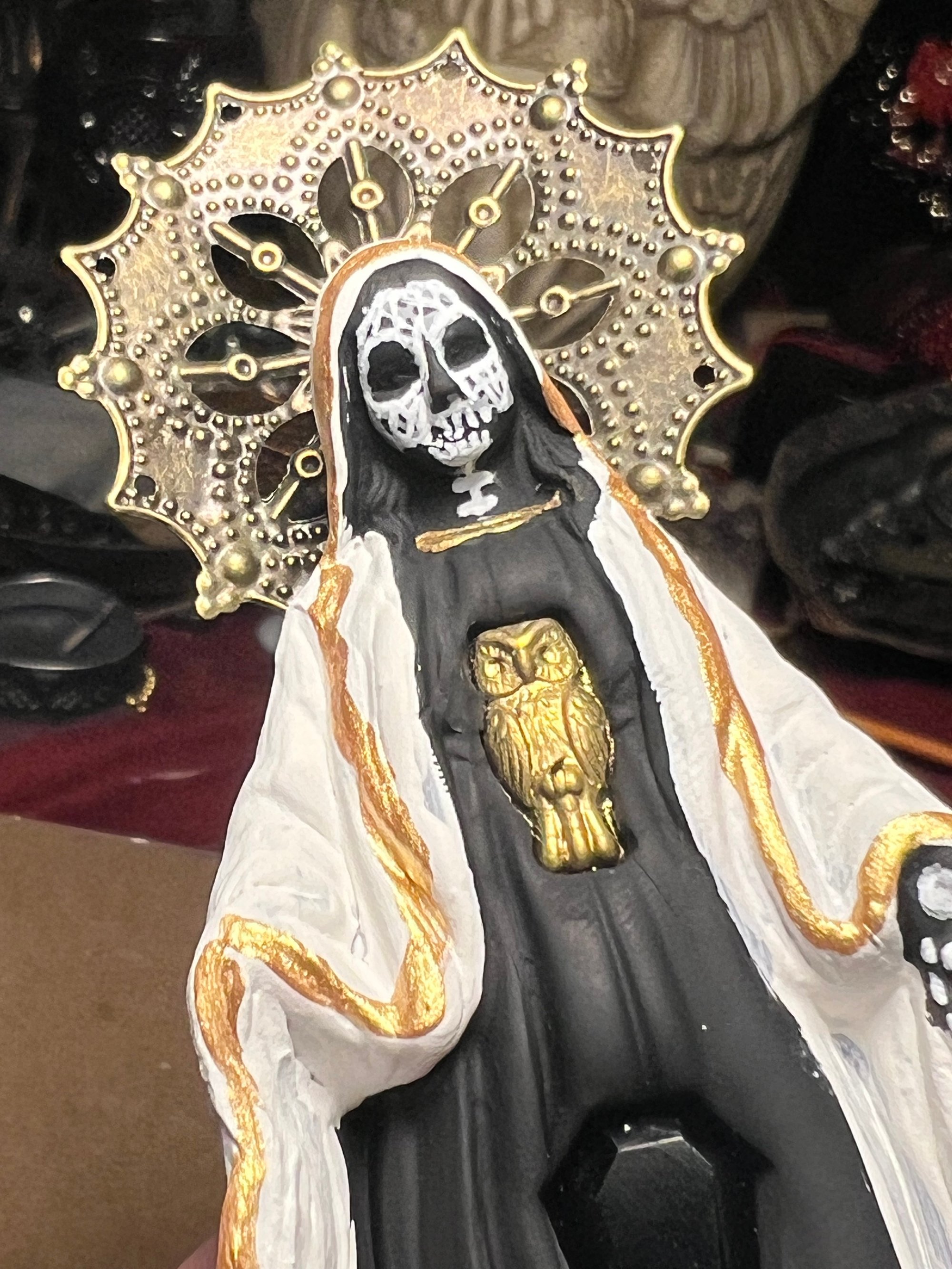 Made with black clay and hand painted. Featuring brass halo, gold glass owl, obsidian coffin and bone carved skull. These are made after ordered, please allow 2-3 turnaround time