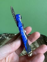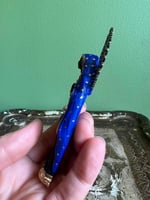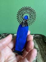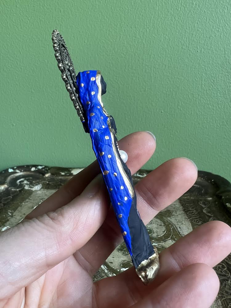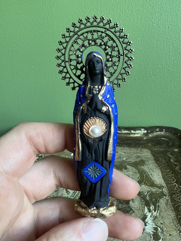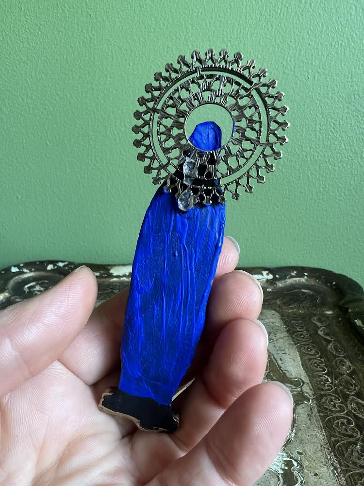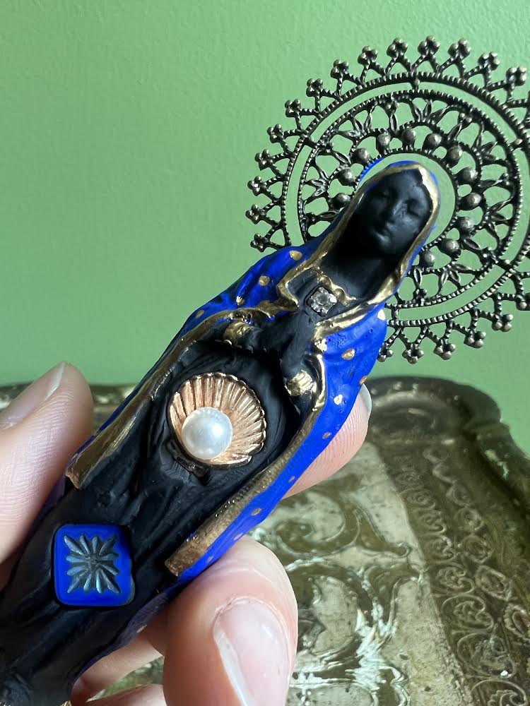 Stella Maris figure with cobalt blue cape with stars. Made with clay, paint, a ceramic star bead, a shell and pearl charm, a vintage rhinestone and brass halo